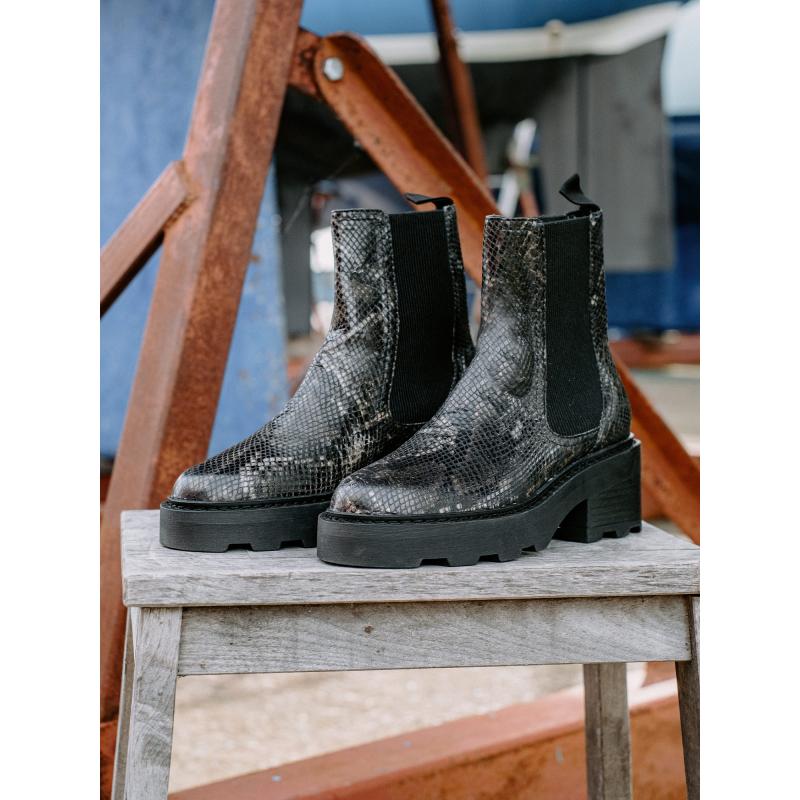 Schmoove signe une version audacieuse de son iconique Mike Chelsea avec son dessus en cuir imprimé python olive. Un boots féminin et ultra tendance avec son bout rond, ses larges élastiques côtelés noirs sur les côtés et son épaisse semelle crantée. Une tirette en nylon sur l’arrière de la tige facilite l’enfilage. Cette bottine possède un large talon de 6 cm dont la cambrure est atténuée par une semelle plateforme offrant un maximum de confort.