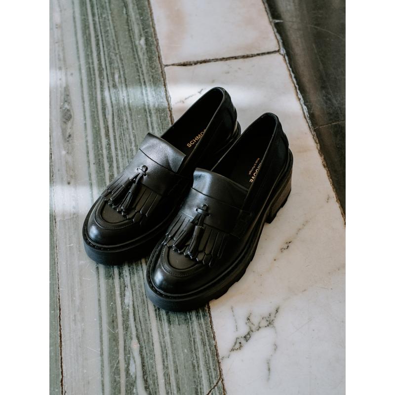Le mocassin noir se réinvente et prend de la hauteur chez Schmoove. Mike Golf conserve les codes traditionnels avec son dessus en cuir lisse, sa patte mexicaine et son bandeau décoré de piqûres sellier et de pampilles ton sur ton. Inspirée de l’univers rock, cette chaussure repose sur une épaisse semelle crantée en caoutchouc avec trépointe cousue et large talon de 6 cm. Avec sa semelle XXL, ce mocassin à plateforme est un essentiel cette saison.