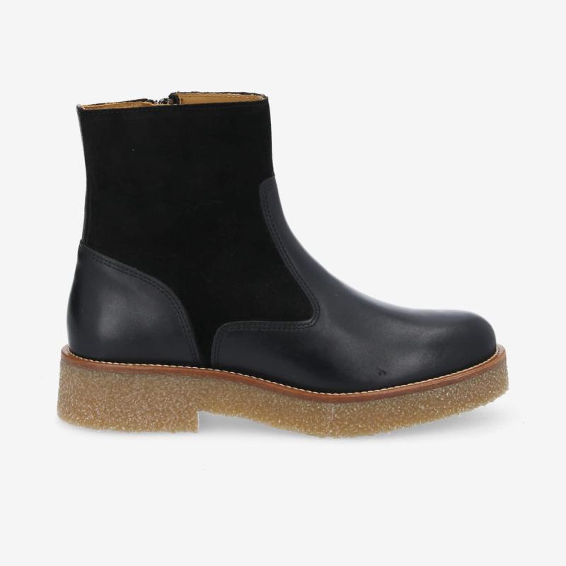 Schmoove présente une version en cuir noir de sa célèbre Dora, facile à associer à l’ensemble du vestiaire féminin. Ce modèle se distingue par son allure épurée, sublimée par un mix de matières en cuir lisse et cuir velours. Il surprend par son épaisse semelle à l’aspect crêpe, rehaussée d'une trépointe en cuir piquée. Cette bottine au style urbain affirmé offre un confort exceptionnel. Dotée d’un zip sur le côté intérieur du pied, elle s’enfile facilement.